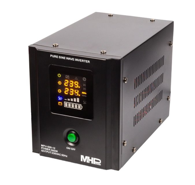 Záložní zdroj a napěťový měnič MPU-500-12 značky MHPower je vhodný pro dlouhodobé zálohování. Je ideálním přístrojem pro své flexibilní použití a robustní celokovové provedení. Přístroj má zabudovanou ochranu proti přetížení, a to jak při napájení z baterie, tak i ze sítě. Výstupní napětí měniče má čistý sinusový průběh. Maximální trvalý výkon činí 500 W.