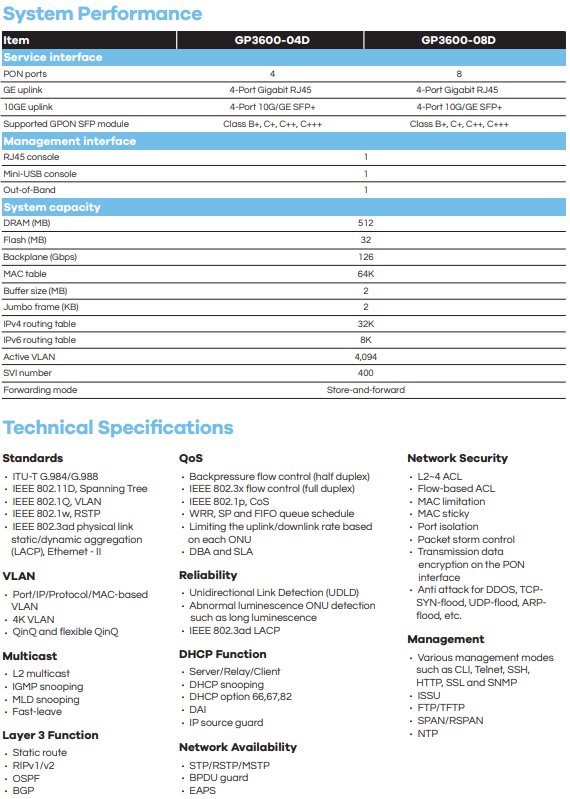 BDCOM GP3600-08D is equipped with 8x gpon ports, 4x GE RJ45 ports, 4x 10GE SFP+ ports, 1x console port and 1x out-band port. Supports asymmetric uplink 1.25 GBPS and Downlink 2.5 GBPS PON Transfer speed.More information