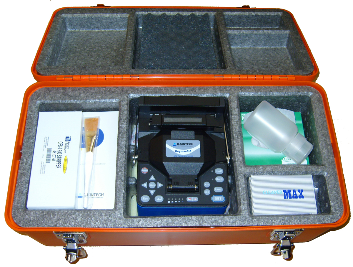 Svářečka optických vláken set - ILSINTECH KEYMAN S1 + lámačka ILSINTECH CI-03B, včetně baterie, 2x pícka pro vypečení ochrany, automatické nastavení vláken ve 3 osách (vystředění na jádro vlákna systémem DCA), 9 sekund na svár, 26 sekund vypečení 60mm ochrany.