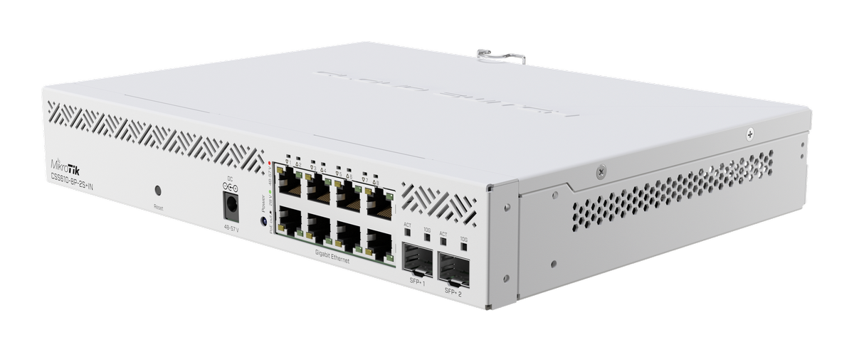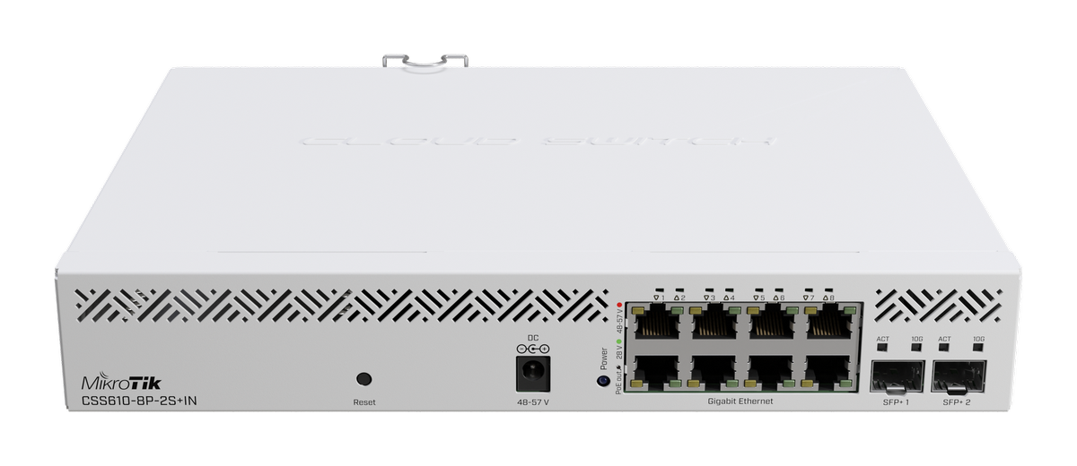 MikroTik CSS610-8P-2S+IN is a manageable PoE switch with 8 gigabit ports and 2 SFP+ bays supporting 10 Gbps transmission. PoE-out with a total budget of 140 W is supported on all ports.More information