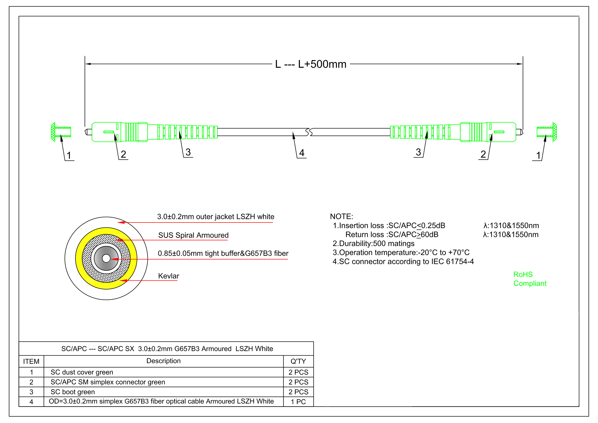 Optický FTTH patchcord, SC/APC-SC/APC, simplex, bílý LSZH, armovaný, G.657.B3 - varianty