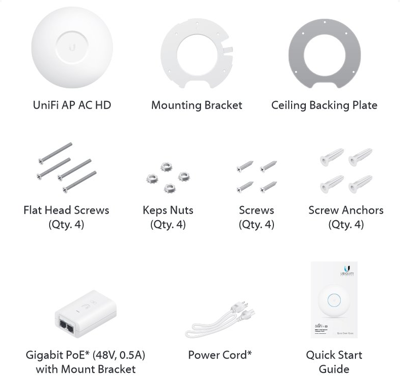 The package contains all the necessary material for mounting a unit on a wall or ceiling. Unifi AC HD is compatible with the UNIFI AC Pro holder.
