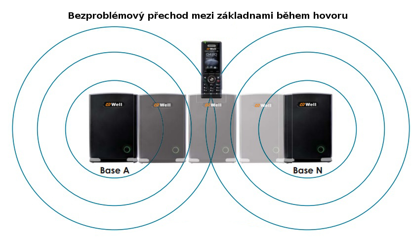 Základnových stanic lze přitom propojit až 40 v rámci jedné DECT sítě s možností roamingu (vytáčení příjem hovoru ze jakékoli základny) i handoveru (přecházení v rámci hovoru) mezi těmito stanicemi.<{r> Současně lze do systému registrovat až 200 ruček. WELL RTX buňkový systém vyhovuje standardům DECT GAP, CAT-iq .